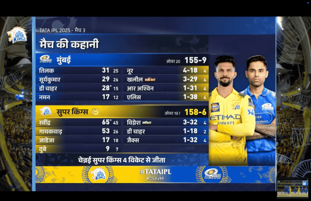 For CSK, this win is massive. Their spin dominance, Gaikwad’s form, and Ravindra’s debut brilliance signal a strong IPL 2025 ahead. On the flip side, MI need a reset. Missing Pandya and Bumrah hurt, but Tilak and Chahar showed fight. They’ll need more to bounce back in this 74-match season.