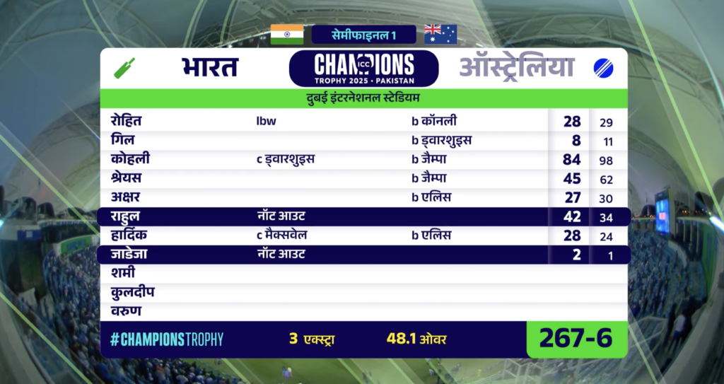 - Australia’s Innings: Australia posted 264 all out in 49.3 overs. Steve Smith (73) and Alex Carey (61) led the batting, but Mohammed Shami’s 3/45, including Smith’s wicket, sparked a late collapse (last 4 wickets for 29 runs). Spinners Varun Chakravarthy and Ravindra Jadeja choked the middle overs, finishing with combined figures of 34-2-176-5.